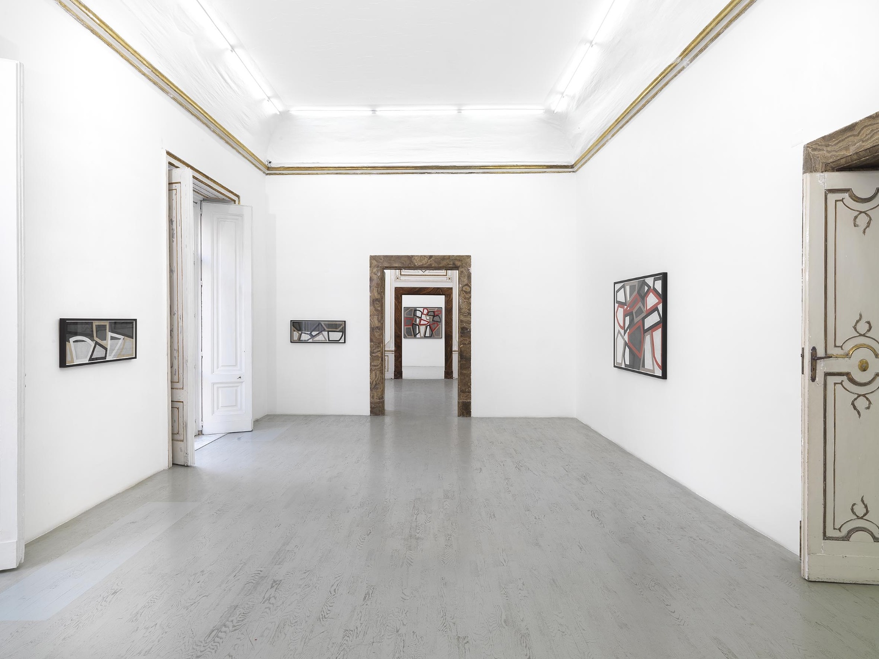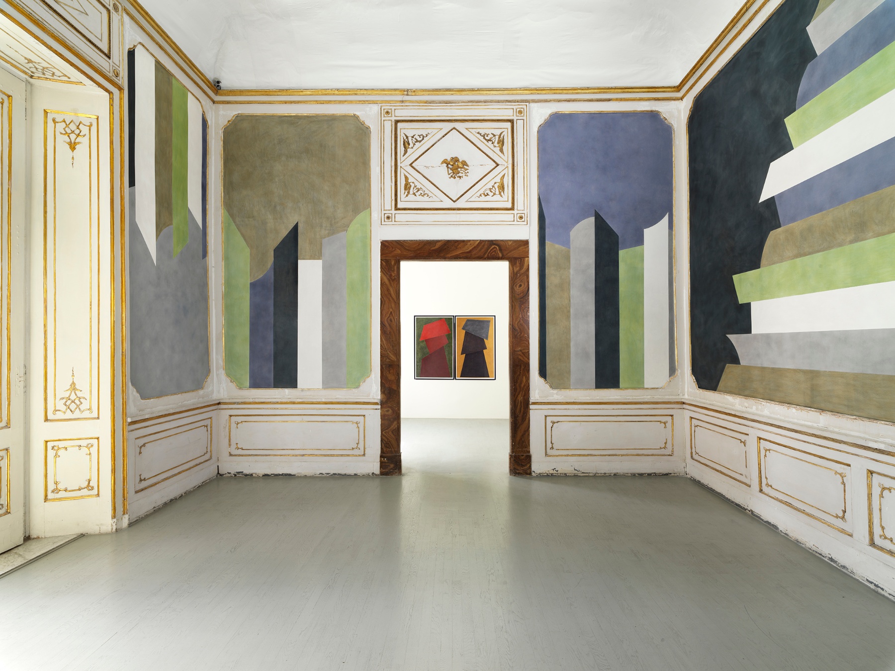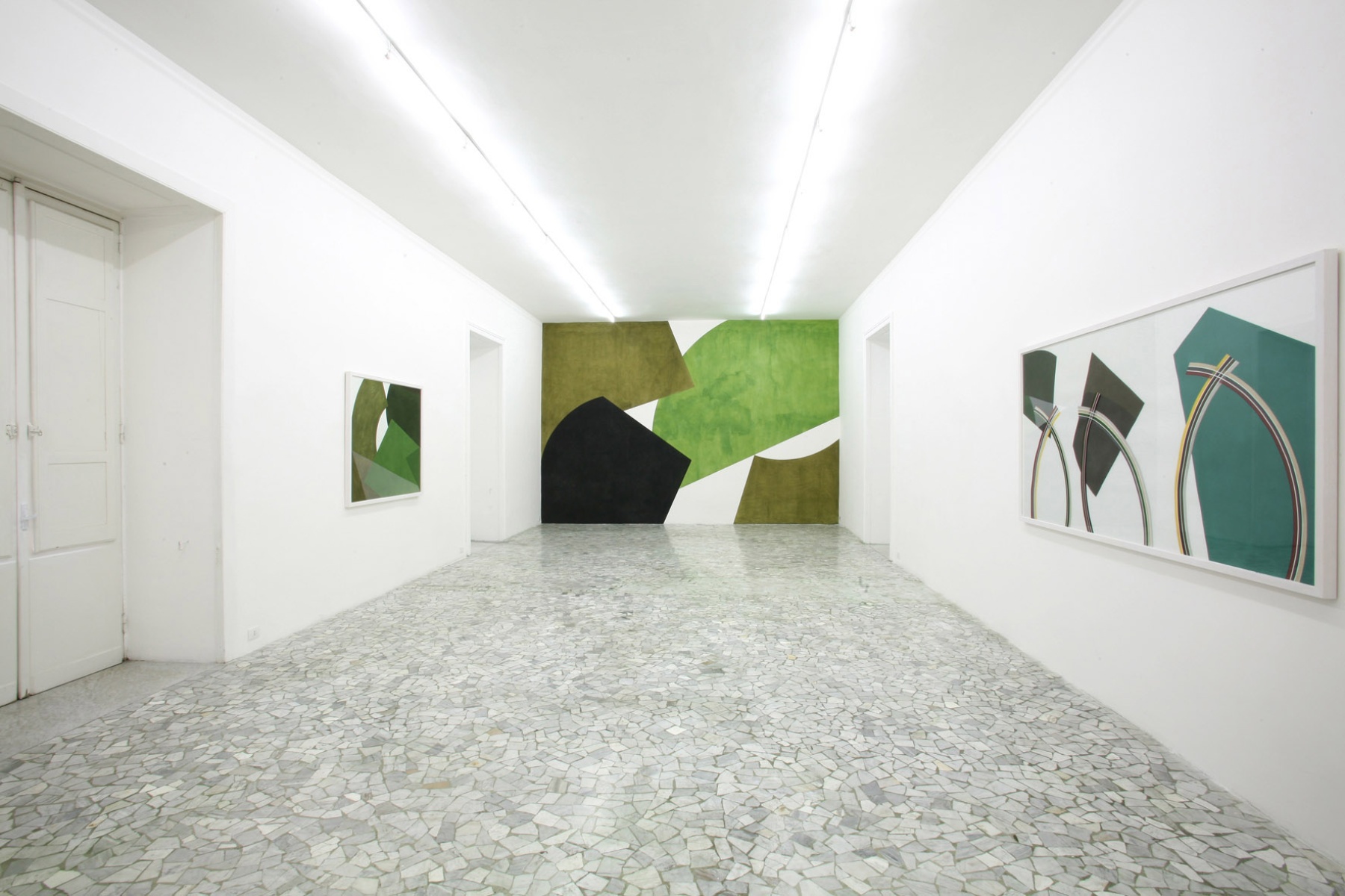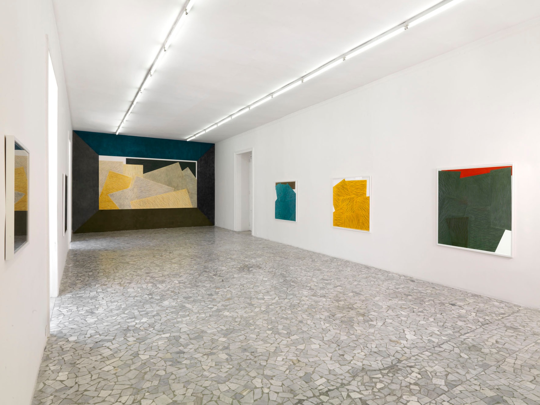Wall drawings and works on paper, one can mirror the other, executed with pastel pigments where the colours and the geometric compositions define the space in a new fresh architectural manner. There is the tendency to think in terms of the unknown space, wondering how walls, ceilings and windows can work and interact with each other. Although predominantly two-dimensional in its result, whether on paper, or on the wall, Tremlett's work has a deep sculptural vein which is strongly recognizable, as his practice has always been sculptural and not painterly.