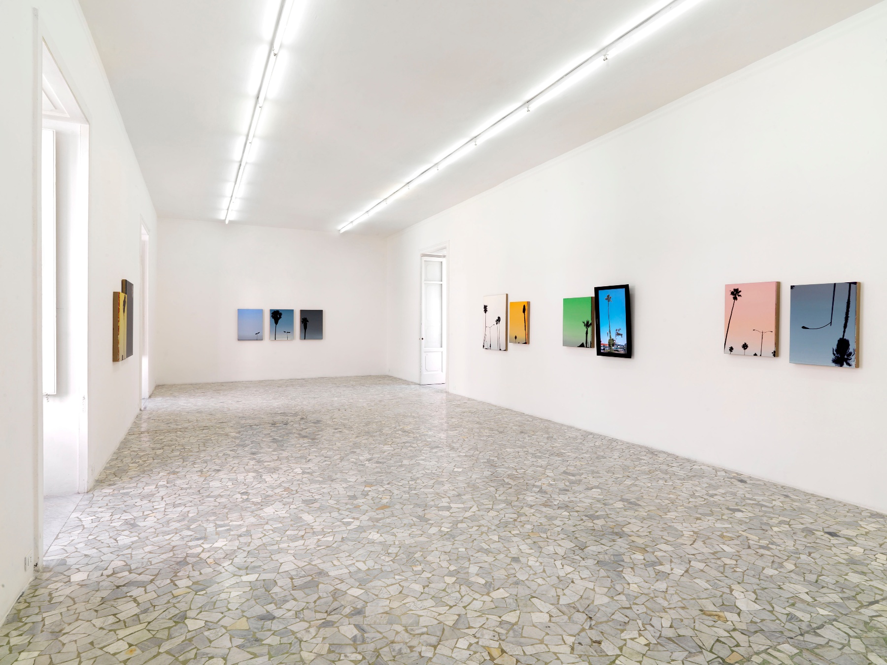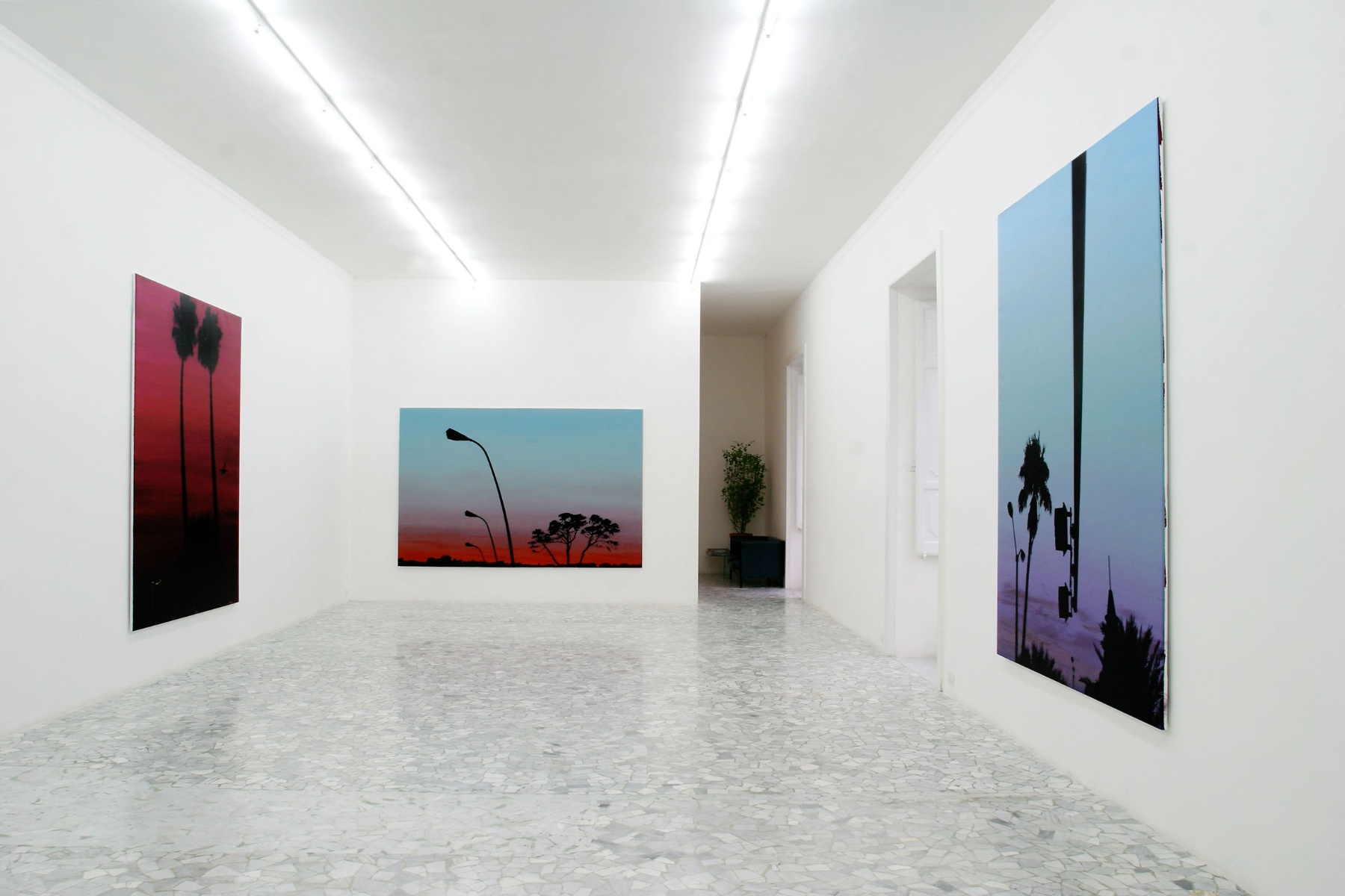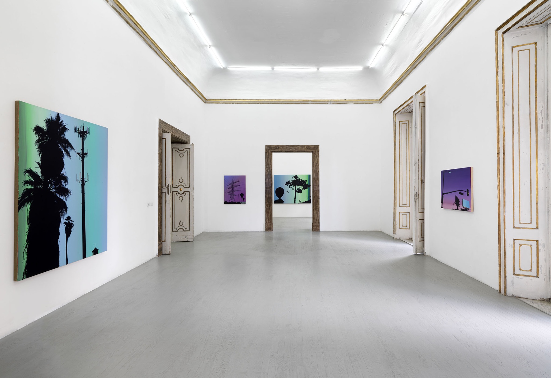 Rubsamen is virtually obsessed with painting sunrises and sunsets. The paintings portray a battle between organic elements and manmade ones, but this conflict seems to rage between completely artificial forces. The vegetation looks to be from a sci-fi horror movie and the man-made elements are all the creations of a mega-communications giant like T-mobile or Vodafone. They are creatures, plants fighting robots, all painted in contraluce against a luminous but sickly sky. Rubsamen contravenes the existing treaties of the landscape genre, applying the strict rules of atmospheric classicism in exactly the wrong ways; using shadow to create depth and luminosity for flatness. The trees and vines in the paintings seem almost human and the cell phone towers and lampposts have the feeling of being organic, they act as vegetation. Everything in these paintings is somehow opposite, but the results are strangely plausible. Rubsamen has created a world where dawn mixes with dusk while mythic characters struggle in the foreground like titans, but they are merely ancient palm trees and upstart microwave antennas. His hyperrealistic painting is reminiscent of contre-jour photography where the foreground motifs appear as black silhouettes. There is hardly any other motif linked as strongly with the notion of desire than sunrises and sunsets they reflect the emotions of our own existential insignificance faced with the expansiveness of the world. In Rubsamen’s paintings the sun’s rising and setting is a metaphor for birth and death, the cycle of life.