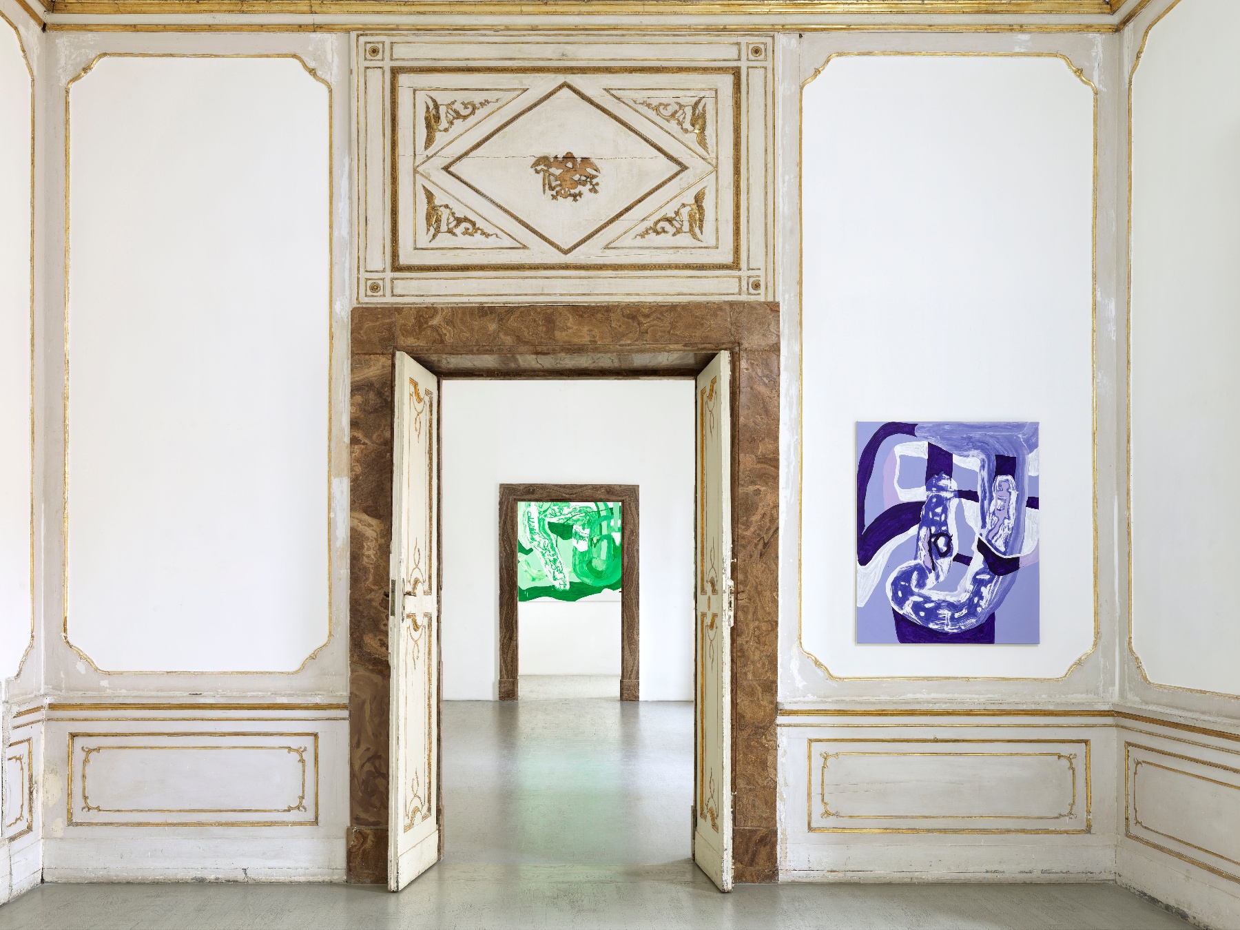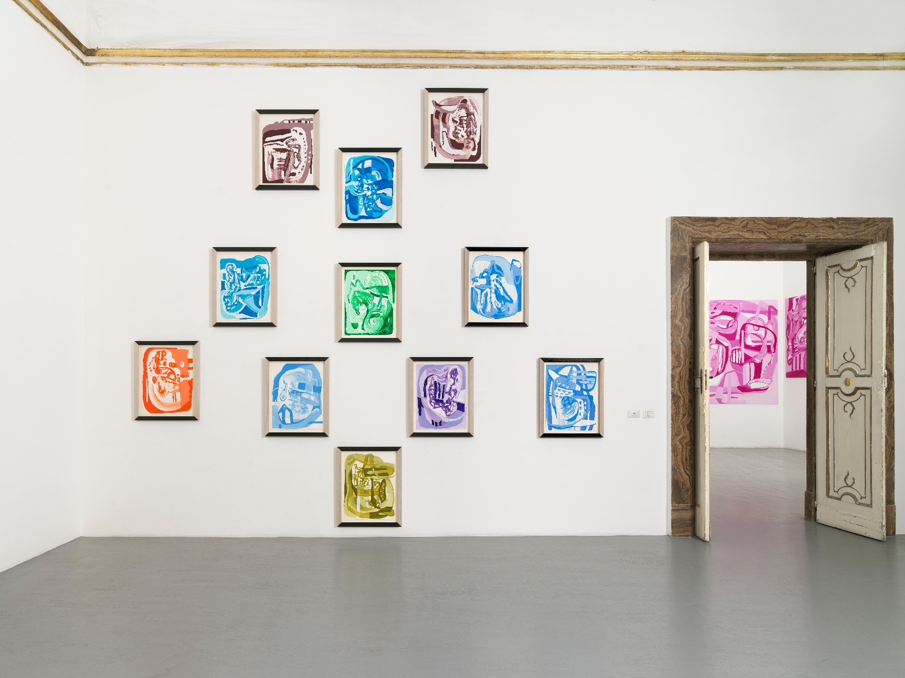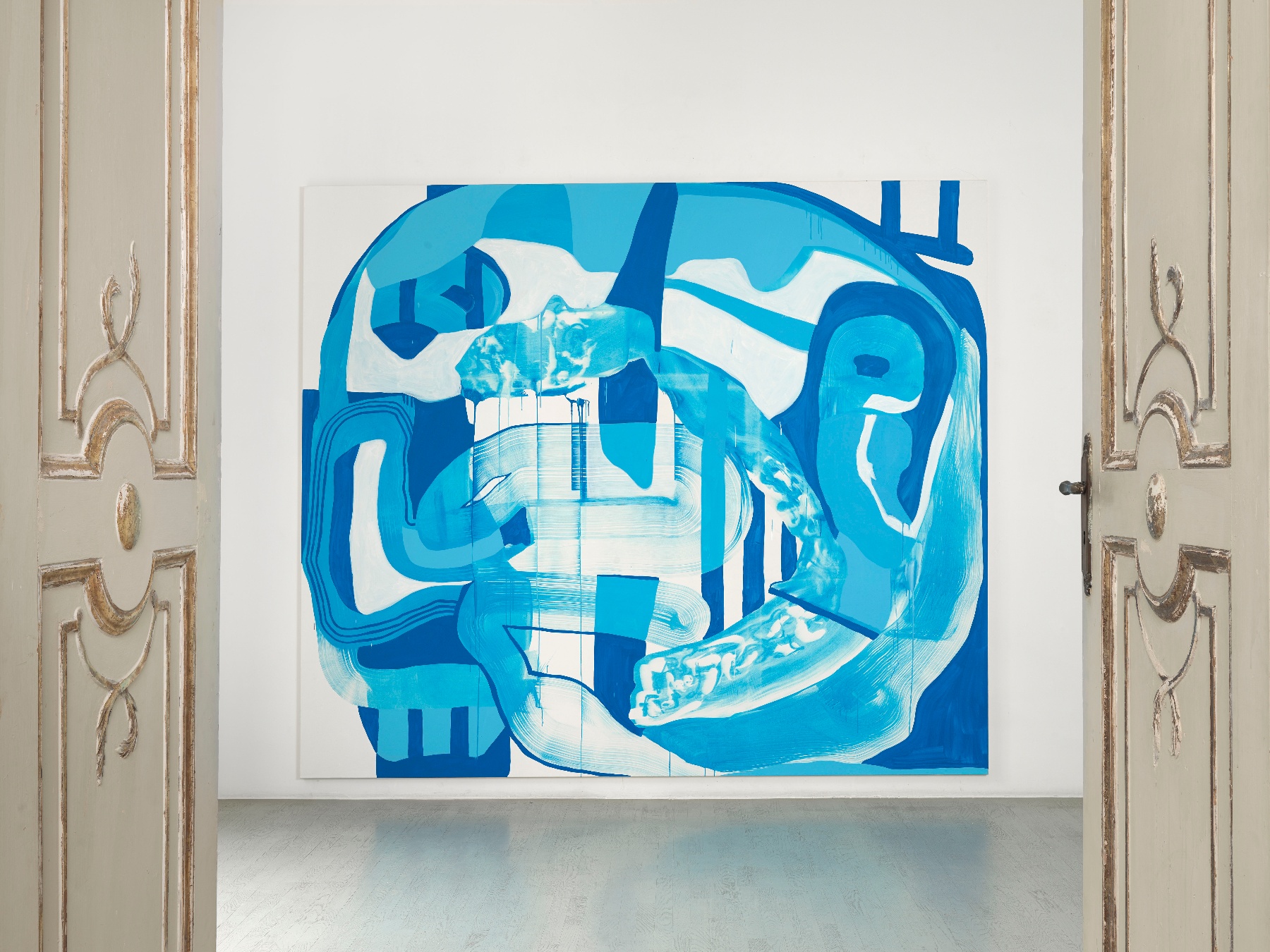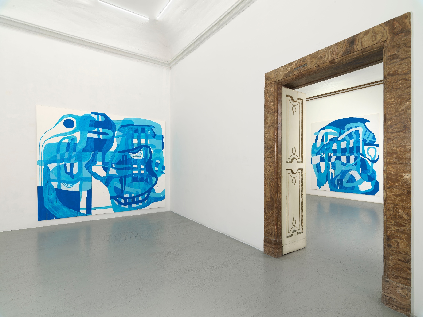 Schröder's artistic practice is based on the action of painting itself. Her formalist education in Albert Oehlen's class at the Kunstakademie Düsseldorf (2005 - 2009) deeply influenced her. The artist's research is based on repetition in which lines, grids or rhythmic networks suggest the elusive movement of the hand. Her labyrinths of enveloping lines are characterized by the use of a highly refined color palette, usually with two or three shades. The slowness of her process characterized by experimental discovery also finds expression in the surfaces, which represent meticulously painted moments that could be understood as negative space or positive forms, depending on how the viewer approaches her compositions.
